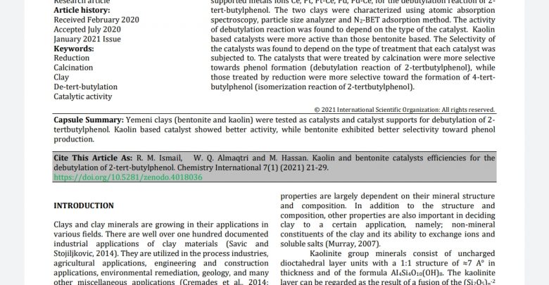 ورقه علميه بعنوان (كفاءة محفزات الكاولين والبنتونايت لإزالة البوتوبلايت من بوتيل فينول) نشرتها مجلة المنظمة العلمية الدولية في
