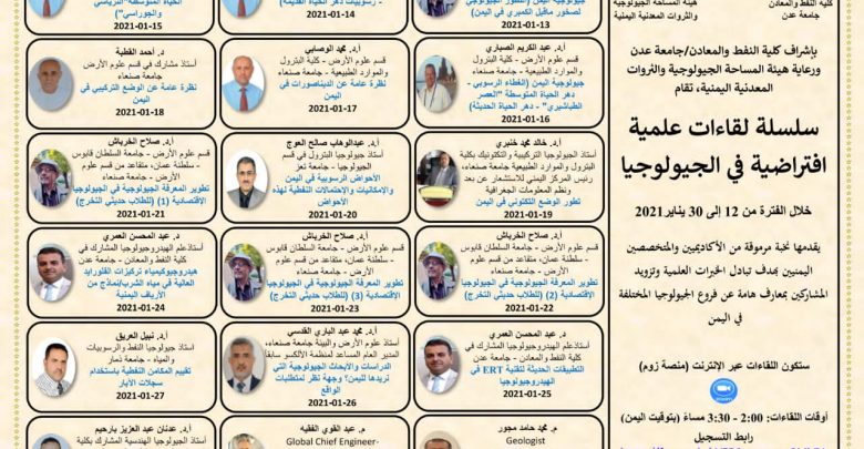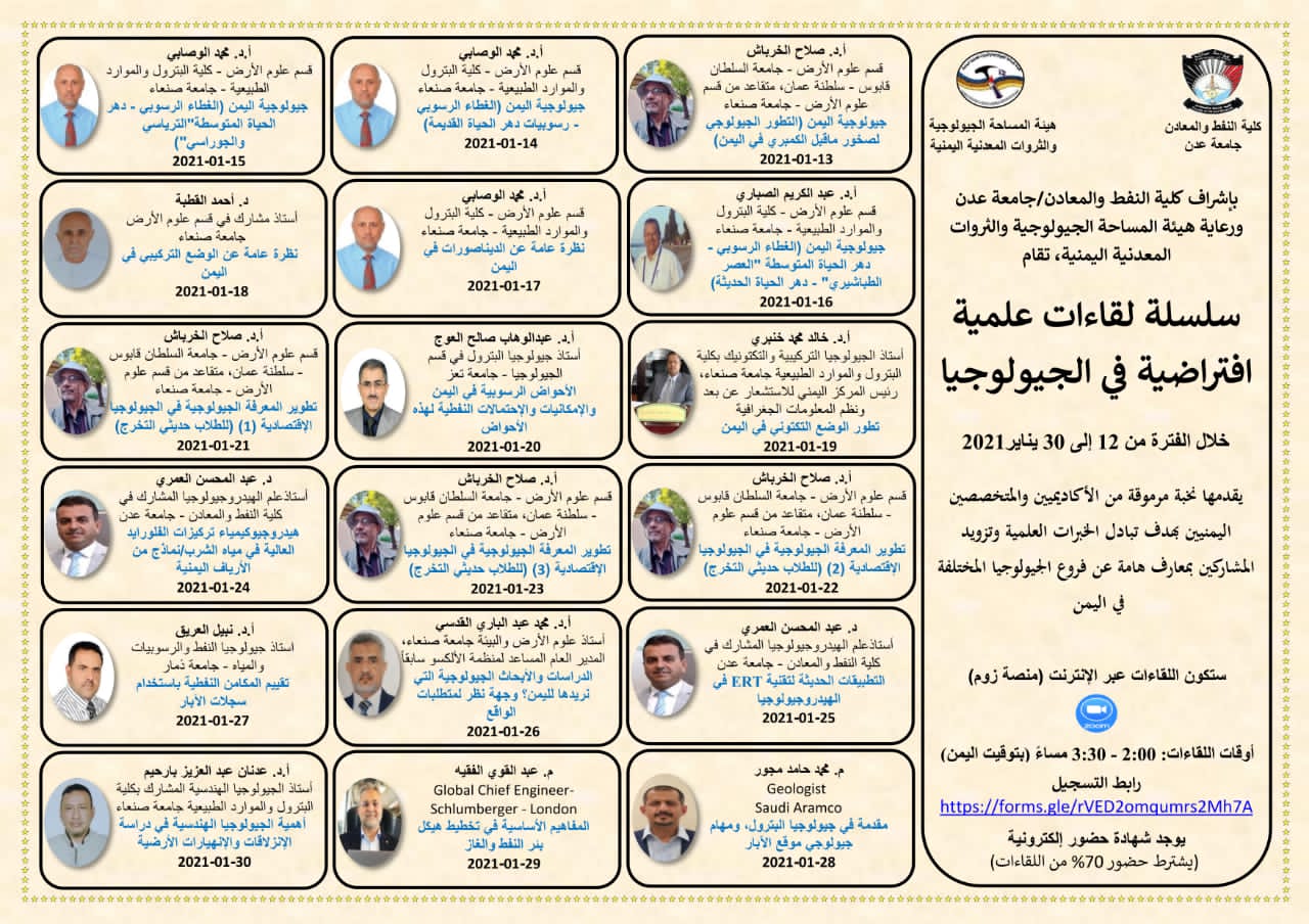 تنظم كلية النفط والمعادن/جامعة عدن بالتعاون مع هيئة المساحة الجيولوجية والثروات المعدنية اليمنية سلسلة لقاءات علمية افتراضية في الجيولوجيا يقدمها نخبة مرموقة من الأكاديميين والمتخصصين اليمنيين وذلك بهدف تبادل الخبرات العلمية وتزويد المشاركين بمعارف هامة عن فروع الجيولوجيا المختلفة في اليمن.