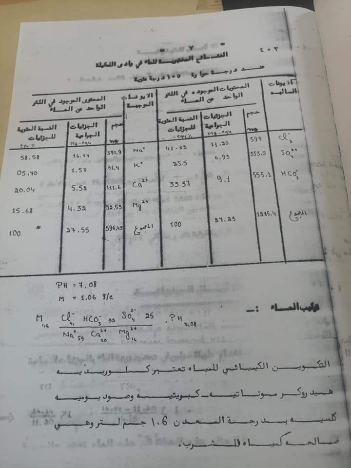 اثناء الاعمال الحقلية أخذت عينة من ماء النبع الموجود في اعلى وادي الكيله وتم تحليلها في مختبر الدائرة. ويذكر ان هذه العينة تأخرت عن التحليل مما قد يؤدي إلى التغيير في خواص الماء الطبيعية ويتضح دائماً بأن تحليل الماء في الحقل مباشرة وخاصة الحمضية (PH) عن طريق الورق الكاشف أو أرساله إلى المختبر مباشرة.