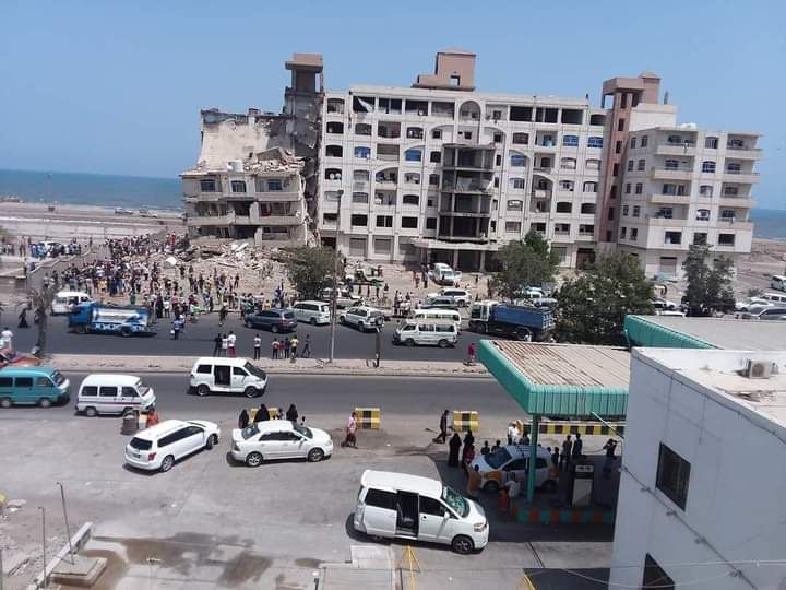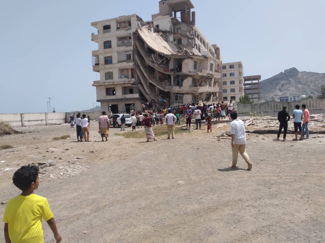 سبب إنهيار المبنى السكني في العاصمه المؤقته عدن (خور مكسر) بين عدم قدرة تحمل التربه أو صاروخ أصاب ساسات واعمدة الجزء الشمالي منها في حرب 2015