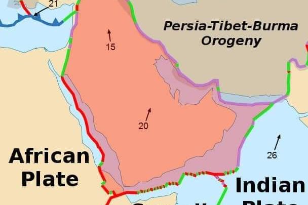 ونقلاً عن الدكتور محمد عبد الباري القدسي حيث قال لنا من خلال الخارطه أعلاه نلاحظ أن الجزيرة العربية الملونة بالاحمر الفاتح تتحرك ككتلة واحدة في إتجاه شمال شرق وتنزلق إمتداداتها التصدعية متوازية امام الصفيحة الاناضولية، فالحركة الأساسية (القوة الدافعة) تحدث في مكانين اثنين خليج عدن (في إتجاه الشمال) والبحر الأحمر (إلى الشرق) ومحصلة هاتين القوتين تتجه إلى الشمال الشرقي. هذا بالإضافة إلى ما يتولد من حركات مساعدة في مناطق البحر الميت وشرق المتوسط. إجمالا: تحرك ألواح القشرة الأرضية تتناسب في هندسة بديعة في تقابل وتباعد وانزياحات افقية متحركة عكس ومع عقارب الساعة، يحركها خالقها كيف يشاء وحينما يشاء وبما يشاء، وجودنا كبشر تنصب حول تفسير الأسباب بما وهبنا الله من علم وسخر لنا من إمكانيات. والاهم من كل ذلك في توقي الكوارث إتخاذ الأسباب اللازمة والمعروفه، فالزلازل ليست هي الخطر (والدليل لو اننا في خيمة لما تقدمت الخيمة) وإنما الخطر في بعد الناس عن التعمق في علوم المخاطر (براكين وزلازل)، وعدم الأخذ بأسباب التوقي ومنها البناء وفقا للكودات الزلزالية وغيرها.