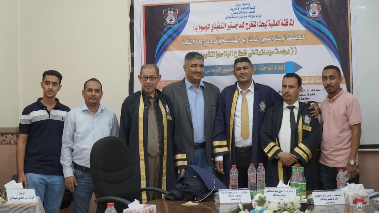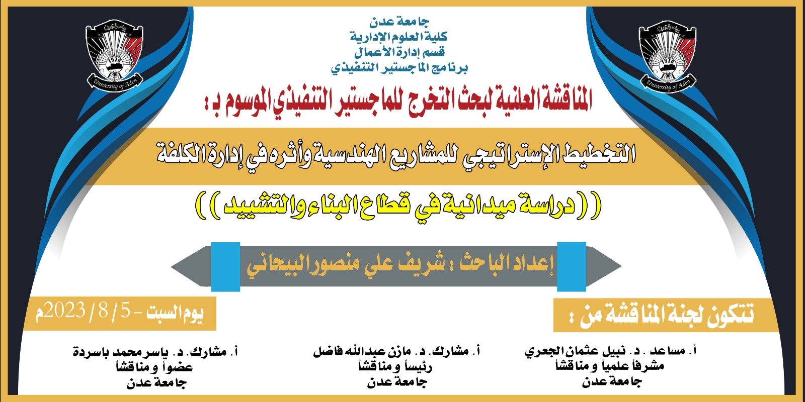 ناقش يوم السبت الموافق 5 أغسطس 2023 المهندس الجيولوجي شريف البيحاني رسالة الماجستير في الادارة ( إدارة المشاريع الهندسية) في كلية العلوم الإدارية بجامعة عدن. جاء عنوان الرسالة “التخطيط الاستراتيجي للمشاريع الهندسية وأثره في إدارة الكلفة”.