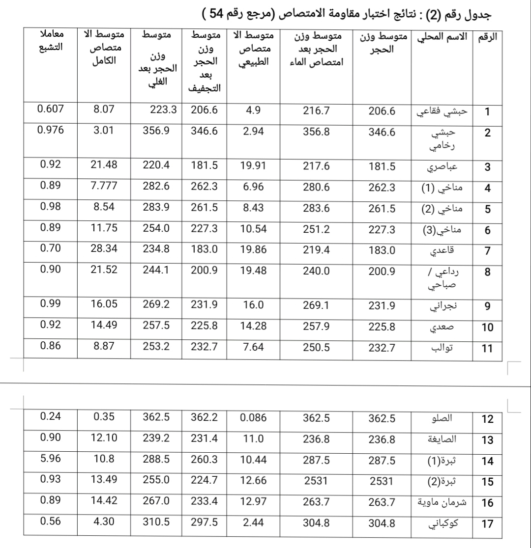 جدول رقم (2) : نتائج اختبار مقاومة الامتصاص (مرجع رقم 54 )