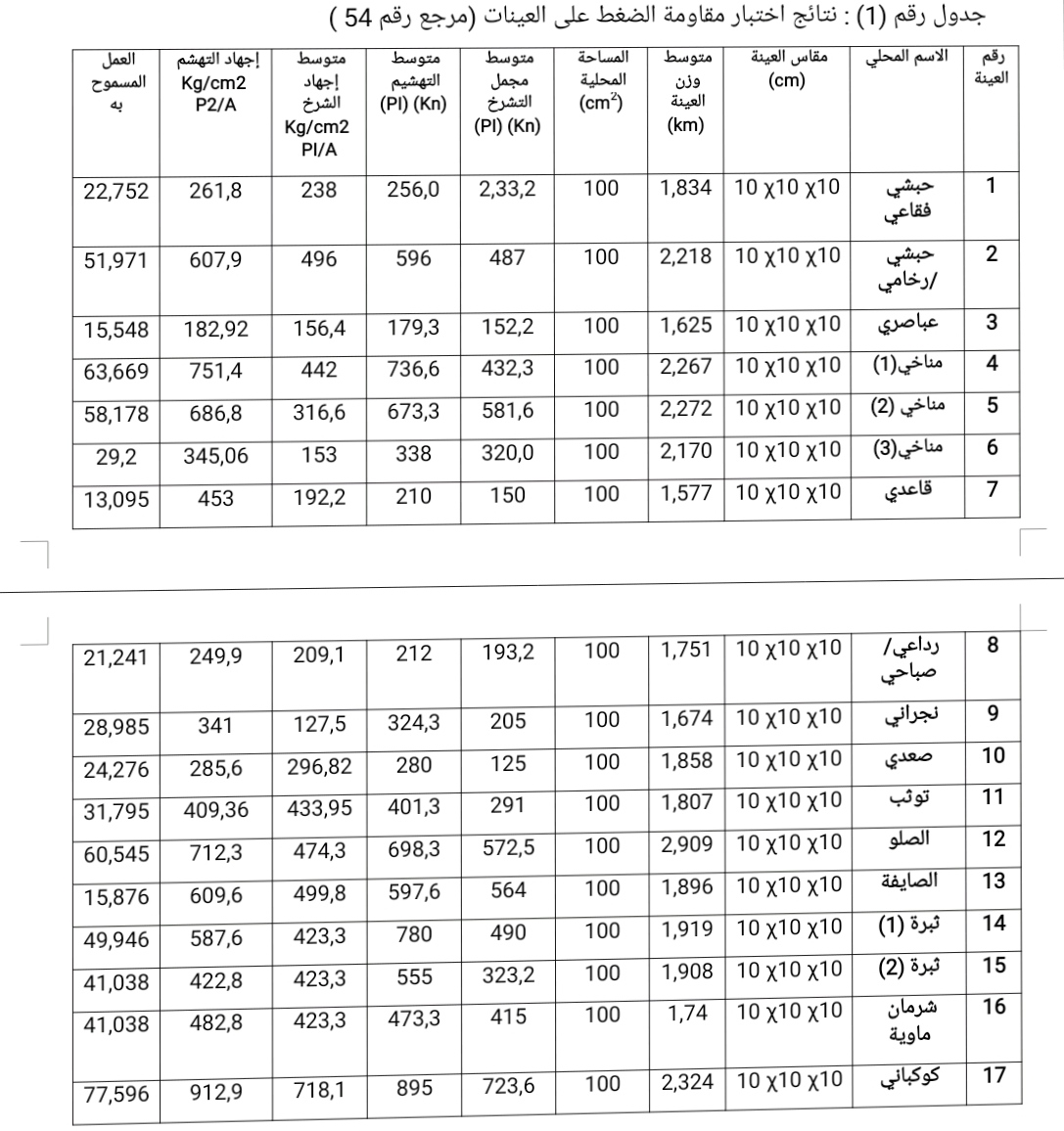 جدول رقم (1) : نتائج اختبار مقاومة الضغط على العينات (مرجع رقم 54 )