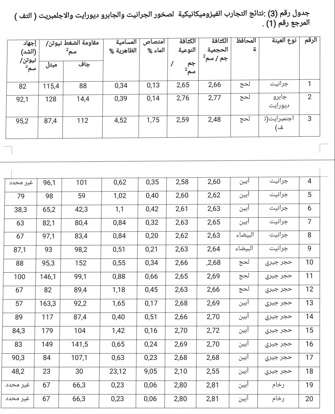 من خلال الاطلاع على نتائج الاختبارات التي أجريت لعدد من عينات الأحجار اليمنية والمبينة في الجدوال (1,2,3) يمكن القول ان مسامية الحجار التف تقترب من مسامية الحجر الجيري (في محلول كبريتات الصوديوم) ويعزى ذلك الى تركيبها المعدني الذي يخلو من المواد الجيرية والمعادن المتجوية ، اما الحجر الصعدي فقد تفتت بالاختبار الرابع ويعود ذلك الى تركيبه المعدني (مواد جيرية ناعمة ) وليس معنى هذا ان الأحجار الجيرية لا يمكن البناء بها ولكن ينصح بعدم البناء بها في المناطق المشبعة بالرطوبة الحامضية في حين أظهرت صخور الرخام والجرانيت وما شابهها انها ذات خصائص فيزوميكانيكة جيدة . ولذلك وجب القول ان الدراسات المعدنية امر لا يجب اغفاله كما يراعي عند اختيار الأحجار مدى ملامتها للظروف التي ستوضع فيها فعلى سبيل المثال احجار بناء الأساسيات والجدران الساندة .