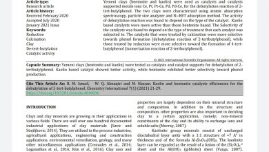 ورقه علميه بعنوان (كفاءة محفزات الكاولين والبنتونايت لإزالة البوتوبلايت من بوتيل فينول) نشرتها مجلة المنظمة العلمية الدولية في الكيمياء الدولية..…